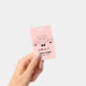 Name badge with a drawing of a cute pink pig's face. Wearing a black bow tie. Lifted up by his black cloven hooves and peering over at you. Cute and whimsical drawing. Set on a pink background with some faded hearts here and there.