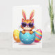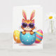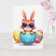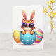 This design shows a ginger-toned, humanlike cat with long rabbit-like ears peeking up from a cracked sky-blue egg with small white dots, giving a coy, friendly look 🐰. The cat wears purple sunglasses, and the tilt of its head suggests it’s sharing a private joke with whoever is holding the card. A golden-yellow egg sits to the left, decorated with tiny white starburst shapes that feel like little sparks around the scene. On the right, a second egg features wide horizontal stripes in pink, light blue, orange, and yellow, with a few contrasting circular accents that add rhythm. Everything rests on a bright white background, where soft lighting and faint shadows make the eggs and character look smooth and slightly three-dimensional. The greeting text appears above the eggs in a gentle pastel tone, with a smaller line placed near the bottom in a light gray, leaving plenty of open space for the artwork 🌷. The central egg is split into jagged shell pieces, with the top half tipped back and the lower half cupping the character’s face.
