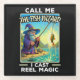 This whimsical image features a wizard dressed in a purple robe and hat, standing by a river or lake, holding a fishing rod with a fish on the line. The wizard has a long white beard, adding to the mystical feel, while the scenic background showcases mountains and a bright sky, enhancing the enchanting atmosphere. The text "THE FISH WIZARD" at the top adds a playful touch to this imaginative scene, blending elements of magic and everyday activity into a charming visual.