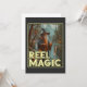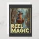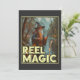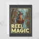This whimsical image features a wizard standing by a river in a forested area, holding a fishing rod with a fish floating towards the line. Dressed in traditional wizard attire, including a long robe and a pointed hat, the wizard casts a magical spell while fishing. The background, with trees and mountains, creates a mystical and serene atmosphere. The text "REEL MAGIC" prominently displayed at the bottom of the image, adds a humourous and magical touch to the scene.