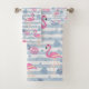 Towel set with a pattern with a fun summery vibe. Pink flamingos and pineapples set on a light blue striped pattern with leaves and hearts all around.