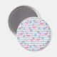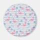A magnet with a pattern with a fun summery vibe. Pink flamingos and pineapples set on a light blue striped pattern with leaves and hearts all around.