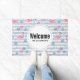 Welcome doormat with a pattern with a fun summery vibe. Pink flamingos and pineapples set on a light blue striped pattern with leaves and hearts all around.