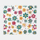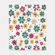 This artwork features a playful and cheerful pattern of stylised flowers scattered across a white background. The design incorporates a vibrant palette of red, yellow, green, and beige, with each flower composed of simple, rounded petals. The flowers are interspersed with small dots and leaf-like shapes, adding to the lively and whimsical feel of the composition. The arrangement is random and free-spirited, creating a lighthearted and fun atmosphere with its bold, colourful blooms.