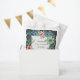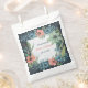 A beautiful wedding favour bags that has the design of a floral frame with leaves against a dark background, in the style of dark aquamarine, textured illustrations, watercolor and vibrant colours of cool blue, salmon and greens. Personalise for your guests!