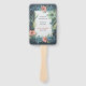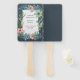 A beautiful wedding hand fan that has the design of a floral frame with leaves against a dark background, in the style of dark aquamarine, textured illustrations, watercolor and vibrant colours of cool blue, salmon and greens. Great for guests!