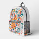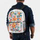 This backpack features a luxurious pattern of floral swirls painted in vibrant shades of orange, teal, red, and green, dancing across a crisp white fabric.