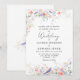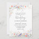 The invitation showcases a hand-painted watercolor frame of soft meadow wildflowers in shades of pastel blue, peach, and lavender. Nestled among the blooms are sweet blue birds symbolizing love, joy, and new beginnings. Elegant serif lettering paired with romantic script typography creates a timeless garden floral wedding invitation style.