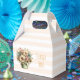 A tiny favor box with a cute image. Blue. pink and cream colored flowers with green leaves. Set inside a green flower pot with a green plaid cloth hanging over the side.
