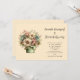 A wedding invitation with a cute image. Blue. pink and cream colored flowers with green leaves. Set inside a green flower pot with a green plaid cloth hanging over the side.