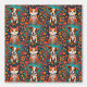 Cute brown and white puppy dog and orange kitty cat surrounded by orange and pink flowers with a blue background.