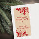 Winter holiday vertical gift label featuring red, whimsical, folk art style snowflakes and customisable text "A very merry Christmas to", a blank space to hand write a name on and your name on a Kraft paper look (printed image) background.