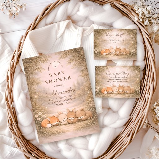 A charming storybook-style woodland design featuring soft forest animals nestled among delicate florals and greenery. The muted neutral palette and hand-painted illustration feel create a warm, timeless look that’s perfect for a cozy, nature-inspired baby celebration. Ideal for parents who love classic woodland themes with a gentle, whimsical touch.
