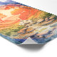 This captivating watercolor piece illustrates a tranquil forest landscape featuring a gentle stream meandering over polished, rounded stones. Enveloped by softly hued trees in autumn shades, the stream traverses a serene grove, fostering a warm and inviting ambiance. The vivid oranges and reds of the foliage create a striking contrast with the cooler blues and greens, merging seamlessly to reflect the transition of seasons. The playful, sketch-like lines contribute a whimsical element, instilling a sense of enchantment and tranquillity within the woodland setting.