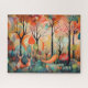 A colourful painting of trees and flowers, in the style of whimsical cityscapes, fantastical and imaginative creatures, distinct shapes, wood, musical colour fields, with a large canvas format.