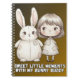 A sweet storybook-style illustration of a gentle little girl standing beside her soft patchwork bunny friend. Best for children’s gifts, notebooks, and journals.