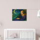 This charming fantasy design depicts a peaceful girl with flowing golden hair, wearing headphones as she gently holds a black cat with a glowing pendant. Behind them, a dreamy night sky with a swirling crescent moon and stars casts a magical glow over quaint houses and winding rivers. Rich tones of teal, violet, and gold give the scene a warm, whimsical atmosphere full of comfort and wonder.