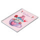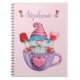 This adorable spiral bound notebook features a funny gnome with a big mustache and long beard, sitting in a purple teacup with a pink heart. He's wearing pink glasses and a red and white striped hat with a blue brim. He's holding a red rose and a heart chocolate. It's personalized at the top with your name and has a heart shaped rose on either side.