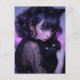 This gothic girl sure loves her black cat! She's hugging it close and seems to be doting on it with a lot of love. In the background, you can see the night falling with beautiful pink and purple hues above some flowers. The cat lady has cat ears which add a touch of whimsy to this illustration. Perfect postcard for any cat lover!