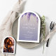 Elevate your wedding invitations with this modern and minimalist arch-shaped design. The soft, fading purple gradient background creates a dreamy and romantic atmosphere, while the bold typography highlights the couple's names. Delicate purple florals add a touch of whimsical elegance.