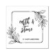 Whimsical greenery leaves framing rubber stamp in script and modern font.