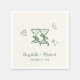 Whimsical light cream napkins for your engagement party, rehearsal dinner, wedding reception, etc., featuring green hand-drawn illustrations of a heart, stars and toasting wine glasses, and the names of the bride and groom in a playful green script.