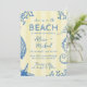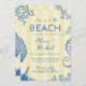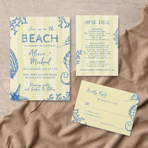 Seaside on the beach fun striped citrus yellow and blue playful unique wedding invitation featuring hand drawn starfish and ocean corals, and a chic whimsical handwritten calligraphy script. +++++++ All colors are editable; digital download available. +++++++++ Suitable for casual trendy beach coastal summer destination weddings.