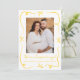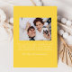 Share your joyful news with this cheerful pregnancy announcement featuring your vertical photo on the front, framed by hand-drawn yellow ribbons and bows on a white background. A handwritten yellow “We’re Expecting!” script pairs with your baby’s due date and names underneath. The back includes space for a horizontal photo and custom message, making it a bright, gender-neutral way to announce your pregnancy.