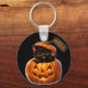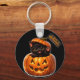 Take the magic of Halloween wherever you go with our pumpkin peeking kitty keychain. This charming accessory features are signature black kitten waving from a glowing jack-o'-lantern set against a deep midnight black background that makes the vibrant orange colour pop perfect for adding a touch of spooky sweet personality to your keys, backpack or purse this durable round keychain is a must have for cat lovers and autumn enthusiast