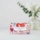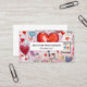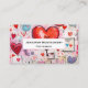 Business cards with a whimsical pattern. Scrapbook style doodles and scribbles. Red and pink hearts and various letters and envelopes scattered all around.