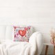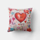 A pillow with a whimsical pattern. Scrapbook style doodles and scribbles. Red and pink hearts and various letters and envelopes scattered all around.