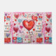 A doormat with a whimsical pattern. Scrapbook style doodles and scribbles. Red and pink hearts and various letters and envelopes scattered all around.