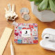 Personalised keychain with a whimsical pattern. Scrapbook style doodles and scribbles. Red and pink hearts and various letters and envelopes scattered all around.