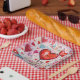 Paper plates with a whimsical pattern. Scrapbook style doodles and scribbles. Red and pink hearts and various letters and envelopes scattered all around.