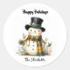 The design on this sticker is a whimsical, smiling snowman in a cute, black top hat. Around his neck is a yellow and blue plaid scarf. He is surrounded by birds and colorful foliage. The text may be personalized.