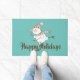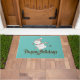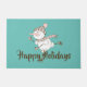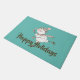 Whimsical holiday doormat features ice skating snowman with brown and pink scarf and beanie on aqua background and customisable text.