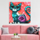 Whimsical Kitty Cat Sitting on Rug Floral Teal Canvas Print