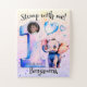 This puzzle is both a sweet activity and a memorable keepsake. Make her first birthday magical with this adorable elephant-themed design just for girls! A bluish-lavender elephant with rosy pink ears stands next to a large number 1 in a pink-lavender-blue gradient — customisable with your child’s photo and date of birth. Floating bubble hearts in shades of pink and blue, gentle plants, and the name of your little girl curved at the bottom complete the look.
