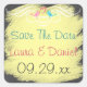 This 1.5" square shaped fun and whimsical chalk board LOOK save the date wedding sticker or envelope seal has a pair of lovebirds on it in shades of pink and orange and blue and green with a hot pink heart between them. There is a fancy ornate white scroll with a FAUX chalk look yellow background that matches the wedding invitation shown below. It would be perfect for a relaxed spring or summer wedding, or an informal or casual wedding or event. Use it to seal your invitations with or attach to your wedding favours or place at your candy buffet table. You can also change the shape and size. ****BE CAREFUL if you do change the shape of the sticker yourself, as some of the design and text may get cut off. To avoid a mis-print, please email me to request another shape. If you need any other matching items, or assistance customising this sticker, please email niteowlstudio@gmail.com.