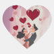A charming, animated-style illustration of a couple lost in a moment of joy and affection, surrounded by vibrant red hearts floating against a soft pink background. The couple, dressed in vintage attire, gaze at each other with expressions of love and happiness, capturing the whimsical essence of romance.