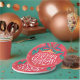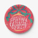 This fun and bright design features a modern text "Merry Christmas" in popular white typography in the shape of a Christmas bauble on a red background with a green bow.