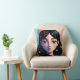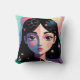 This decorative throw pillow features a captivating, whimsical portrait of a girl with long dark hair, accented by delicate white and pink flowers. The design showcases a modern artistic style with a soft, multi-colored background of teal, pink, and violet tones. This high-quality pillow adds a vibrant and artistic touch to any bedroom, living room, or creative studio space.