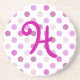 Whimsical monogram stone coasters, with a pink and white polka dot design. A big one letter pink initial, in the middle, is customisable. Personalise with the letter of your choice. Great coasters for any room of the house, and a set would make a lovely gift for any occasion.