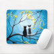 Two cats sitting on a branch watching the full moon with a blue sky filled with stars. The branches of the trees surrounding them with small yellow flowers. Black tuxedo cat and a bi-colour white and grey spotted cat. Original Modern Whimsical Acrylic Painting by Donna Leger. All Rights Reserved. ©irony designs