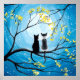 Two cats sitting on a branch watching the full moon with a blue sky filled with stars. The branches of the trees surrounding them with small yellow flowers. Black tuxedo cat and a bi-color white and grey spotted cat. Original Modern Whimsical Acrylic Painting by Donna Leger. All Rights Reserved. ©irony designs