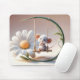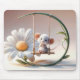 A tiny mouse with big ears sits on a swing hanging from a large daisy stem