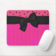 Pretty pink and black mouse pad done in stripes and polka dots, with a big pretty black ribbon and bow going across the width of the mouse pad. Very pretty for at home or at the office.