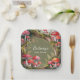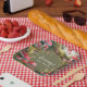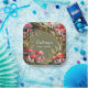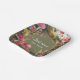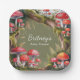 A watercolor illustration of red and orange mushrooms growing in a forest setting. The mushrooms have large, bright red caps with white spots and white stems. Multiple mushrooms of varying sizes are arranged around a central green space, creating a natural frame. The mushrooms grow from moss-covered tree roots and branches that wind through the composition. Green ferns and small plants with delicate leaves are scattered throughout the scene. The background features muted green and blue tones, with a darker olive green central area. The illustration has a soft, ethereal quality typical of watercolor paintings, with gentle color transitions and subtle texture effects. The mushrooms cast subtle shadows beneath them, adding depth to the composition. The artwork has a whimsical, fantasy-like quality with the mushrooms arranged in a circular pattern around the central green space.