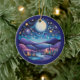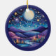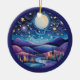 Ornament with a beautiful illustration. Whimsical and fanciful vibe. A big glowing moon with stars all around. Hanging over a lovely landscape of trees, mountains and a winding river. Awesome magical mystical vibe.