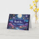 Thank you card with a beautiful illustration. Whimsical and fanciful vibe. A big glowing moon with stars all around. Hanging over a lovely landscape of trees, mountains and a winding river. Awesome magical mystical vibe.